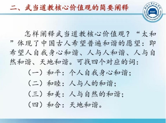 讲座第三部分,杨立志教授集中阐述了武当文化核心价值观(太和)的现代意义,认为“太和”精神对于解决现代人类面临的共同问题有重要启示,可以匡正今日人类社会所发生的种种弊病,对今日人类社会的发展提供有积极意义的经验。